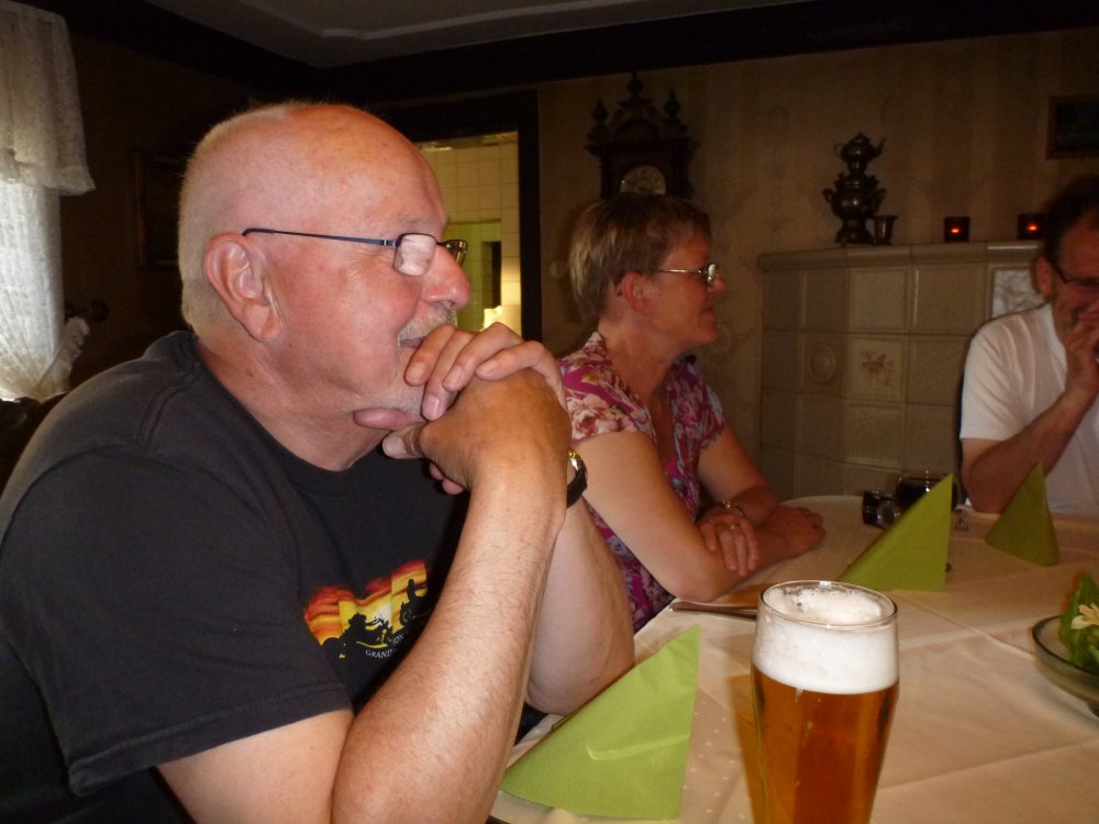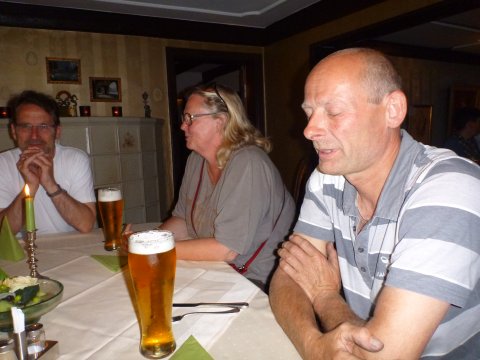 Turleder Ingolf førte flokken ad motorveje og landeveje til Bed and Breakfast Dannevirke i Owslag lidt uden for Slesvig, hvor de ankom kl.20. Efter indkvarteringen var den nærved liggende kro klar med snitzeler og koldt øl. Undertegnede referent, Bodil og Bjarne og Ida, der var ankommet lidt tidligere og allerede havde testet køleskabet, erfarede, at selskabet havde haft tekniske problemer på nedturen. Knud nåede kun til Herning, før han så sig om efter en Better Place batteriskiftestation. De er jo gået konkurs, men så opdagede de kvikke motorcyklister, at et af Lissys batterier kunne monteres, så resten af turen kunne gennemføres, men uden lys fra Knud. Der er jo et pænt stort batteri på en BMW. Balladen om batteriet var årsag til mange vittige kommentarer. Læs mere om Knuds batterieventyr andetsteds på siden. Aftenen fortsatte med hyggeligt samvær på kroen og i Steens Corner.