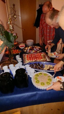 Maden kunne der bestemt ikke peges fingre af, tre lækre retter. Først torsk i slør, så buffet med to slags mørt kød, kartofler og salat. Fulgt af et meget flot kagebord.