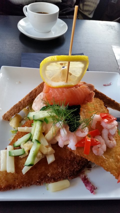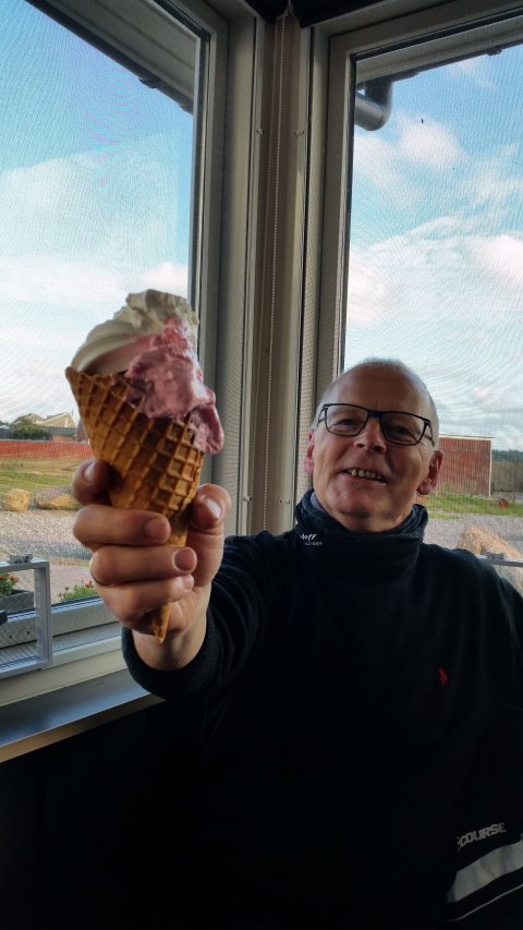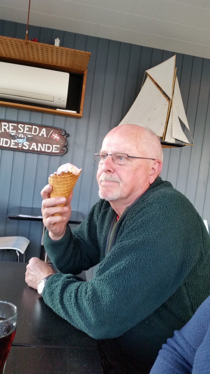 Godt kommet frem til Glyngøre havn, stillede folk mod det lokale spisested, og der blev både bestilt aftensmad, kaffe og is. Det største saglige smil havde Jan dog, men han havde nok også bestilt den største is de havde på menu kortet.