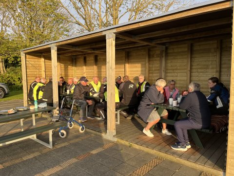 Så blev det Ejner fra turudvalget der skulle stå for tirsdagsturen. Men da det skranter lidt med helberedet, var J.C. Sat på opgaven, med at føre truppen en tur rundt i den friske vind. Vi kørte mod vest af en masse små veje, og gjorde hold ved opkørslen på Thorsmindevej lige efter Høvsørevej, hvor vi gik op til stranden, der kunne vi se de store specialgravemaskiner på afstand, det var dem som vi så på Niels Chr.’s tur tidligere på sæsonen. Derefter gik turen mod Ramme til Sandholmsplads. Der stod Lis og Ejner klar med en fin kaffebord til os.