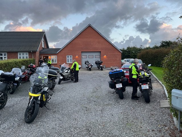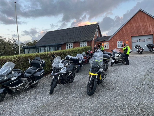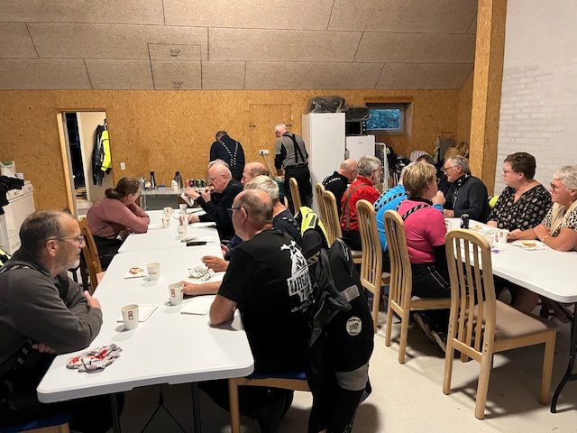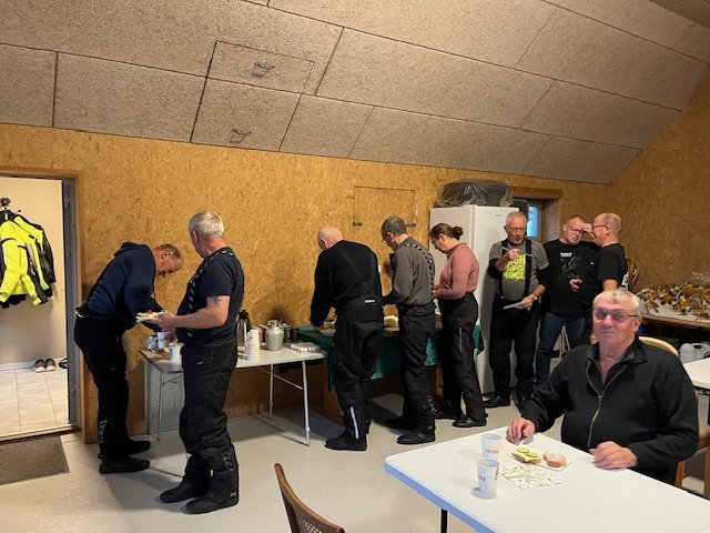 Vi er kommet ind i efterårsmånederne, med blæst og mørke skyer som ind imellem giver store mængder vand, men i aften på køreturen som Jørgen stod for holdt det tørvejr. Vi ankom til Brians fine landsted efter en lille times tid, han havde inviteret os til at komme på besøg, han har fået knæet oppereret så han venter lidt med at køre på den tohjulede. Vi gik til en veldækket kaffe bord, som Gitte og Brian havde stillet an. Snakken gik som sædvanligt godt.