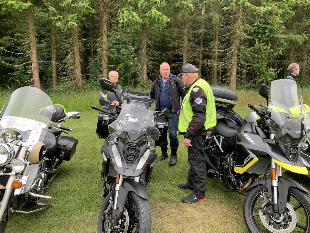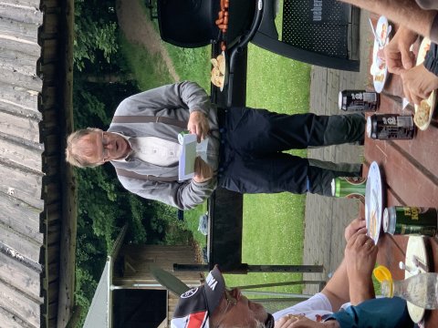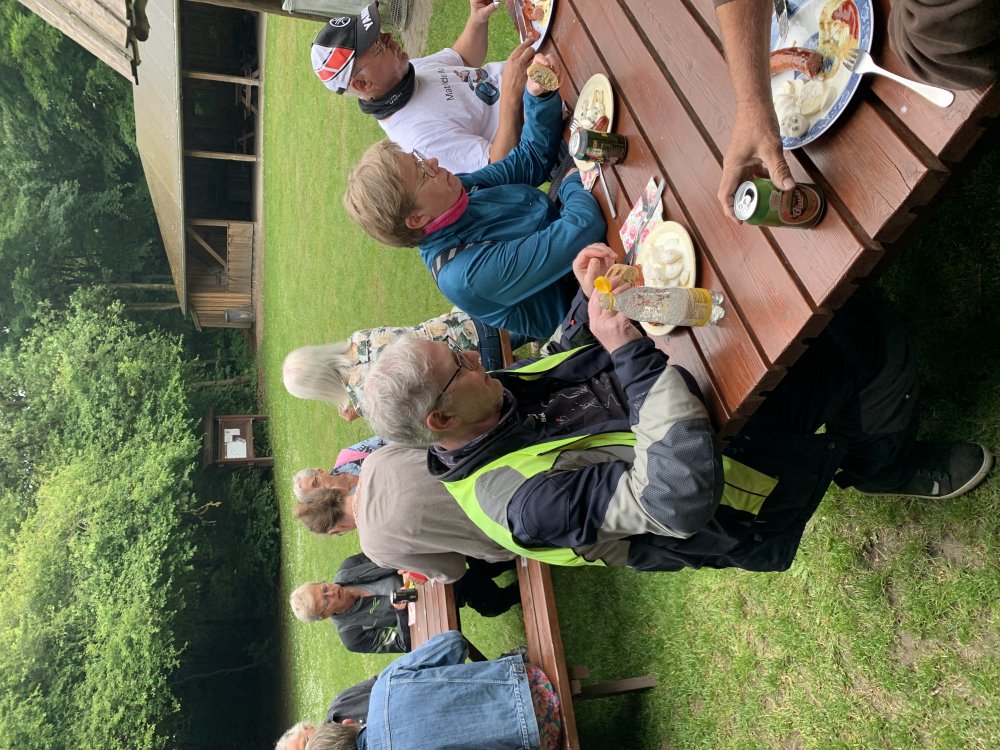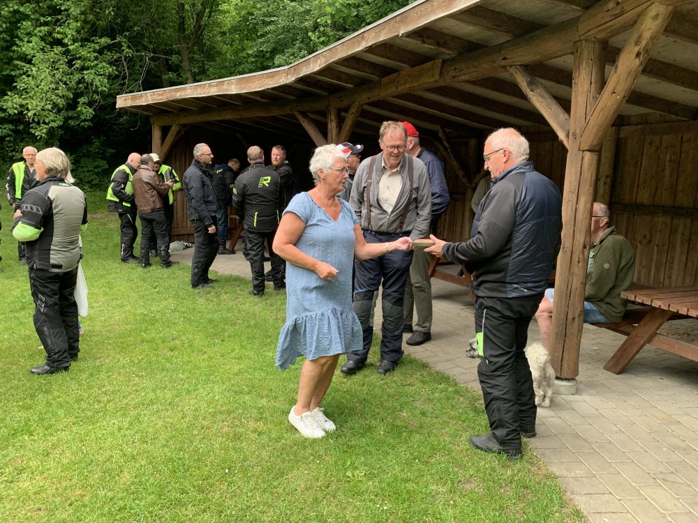 Et sølvbryllup er jo nok værd at fejre, og denne tirsdag aften kunne vi fejre Mc Mathildes sølvbryllup. 22 motorcyklister heraf nogle få med bagsædepassagerer var mødt op på havnen. Med formanden i spidsen kørte vi en tur på en halv times varighed, før vi endte på skovgrill-pladsen i Lomborg. Her havde formand-inden (Vivi) og hjælpere arrangeret den store festmiddag med kartoffelsalat, grillpølser og flutes, og til slut kaffe og et overdådigt udvalg af kager. Jens Lomborg og Karl Anders Kvist fortalte om klubbens tilblivelse for 25 år siden. Der var også en hilsen fra Erik Thomassen, som også var en af initiativtagerne. Da han var på ferie, var han afskåret fra at deltage.