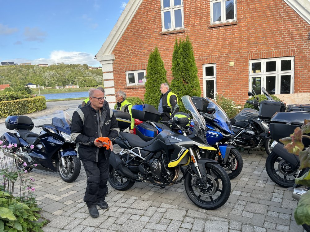 Vi var en lille flok mødt op, vejret var meget truende med kulsorte skyer men vi slap utroligt nok uden en regndråbe på den køretur JC. Førte os ud på. Efter en halv times kørsel ankom vi til Gitte Hovaldt’s fine byhus i Lemvig. Hun havde inviteret os til at komme på besøg. Vivi og Brian ankom i bil. Gitte’s piger kom lidt senere. Vi gik ombord i den fine kaffebord som Gitte havde dækket op til os.
